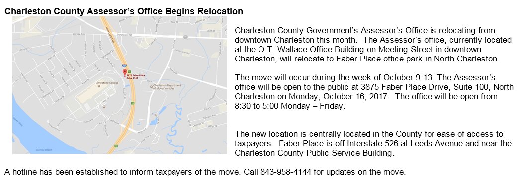 If you qualify for these discounts you may obtain an application from the assessors office any charleston county service center or online. Please note that real property items are land buildings and mobile homes. 101 meeting stthe charleston county assessors office is located in charleston south carolina.