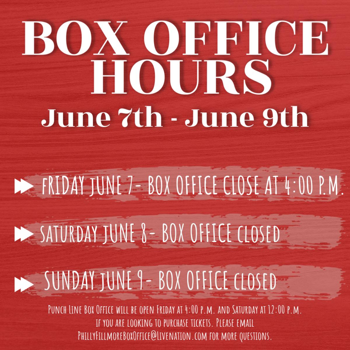 And of course please enjoy. The box office is open monday saturday from 12noon 6pm. We will also be open promptly for any new public on sales for example if a show goes on sale at 10am saturday we will be open at 10am to help you out.